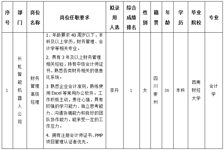 四川長虹虹微科技有限公司關于招聘財務管理高級經理崗位擬錄用人員的公示