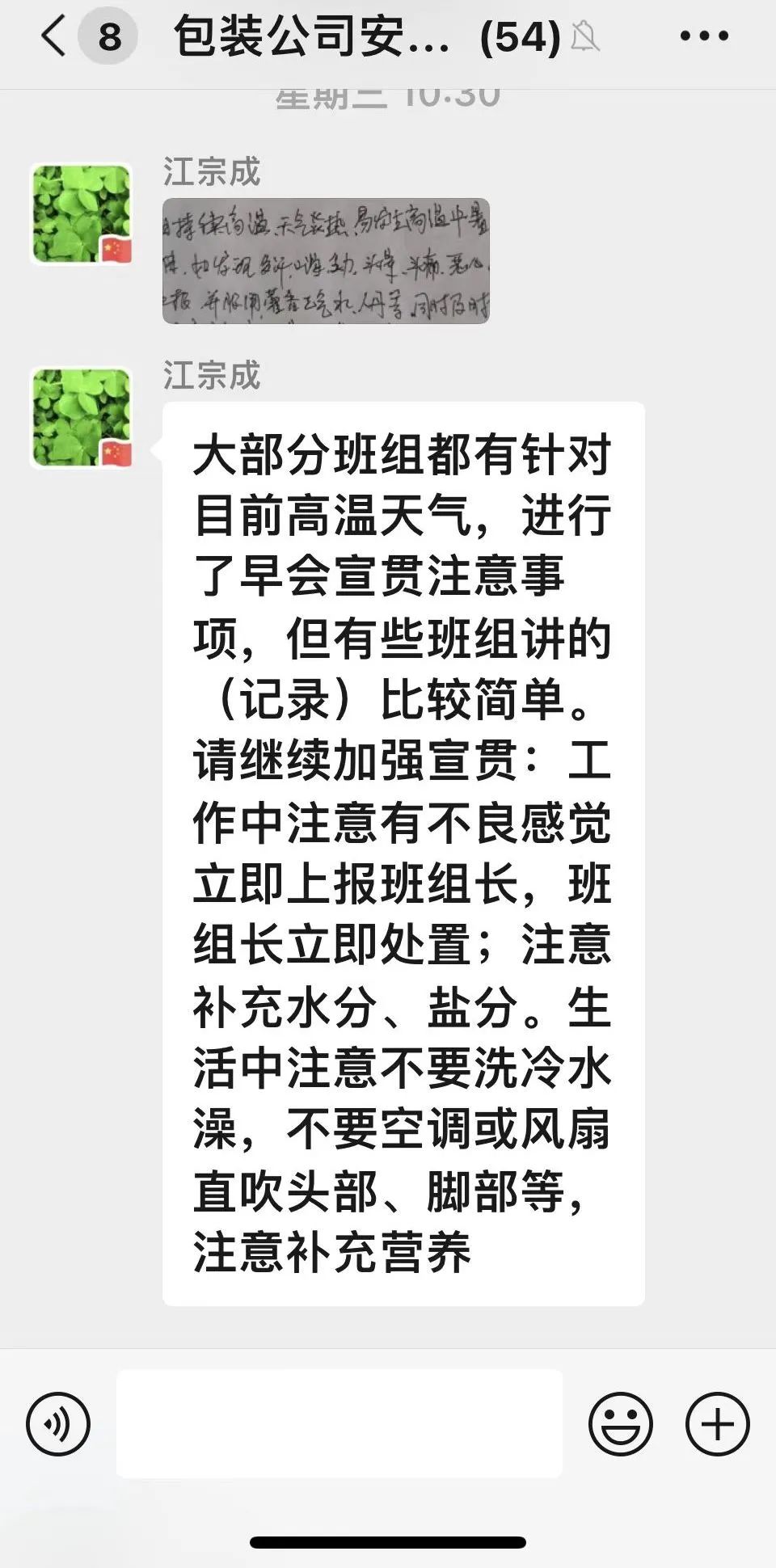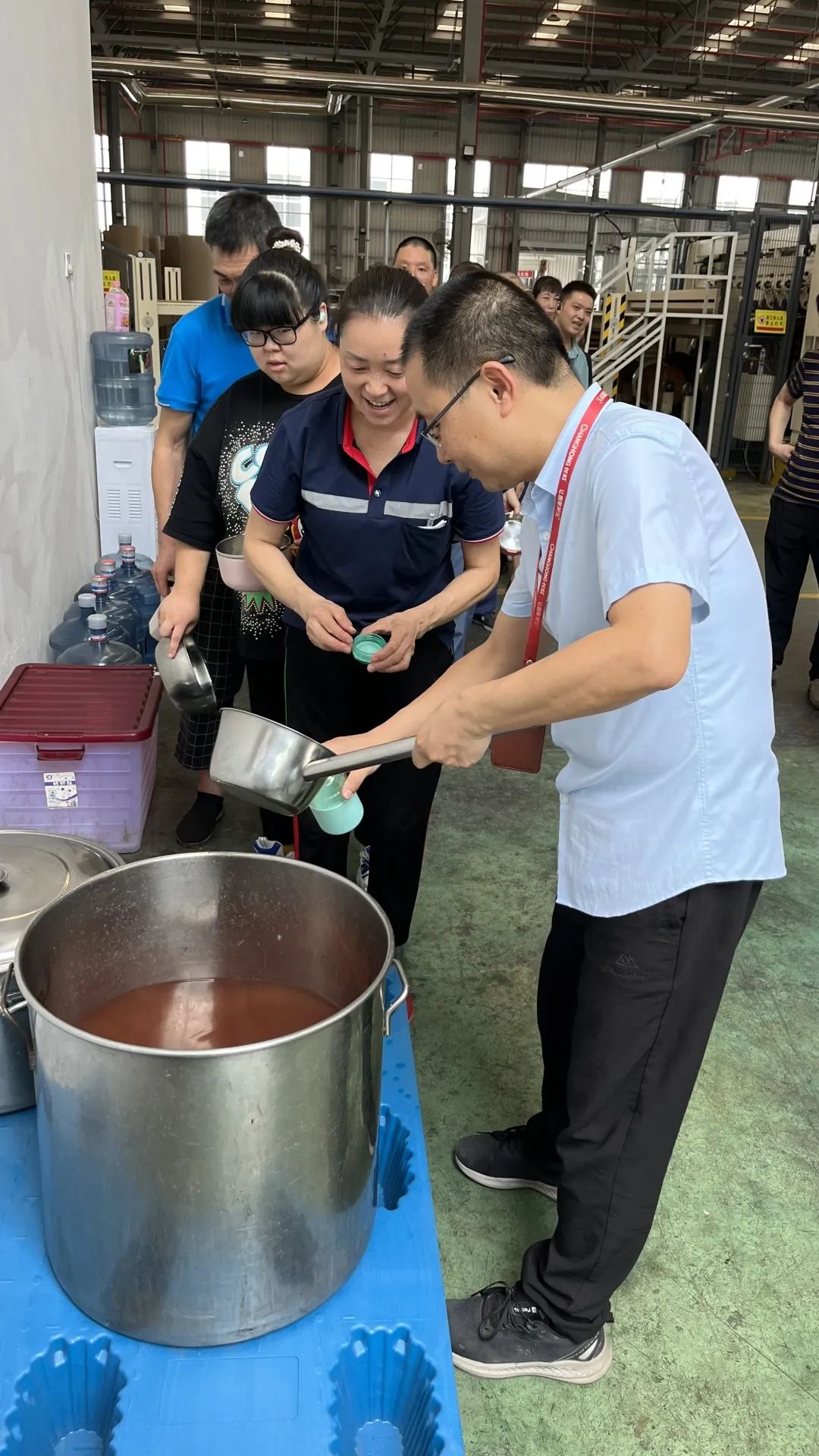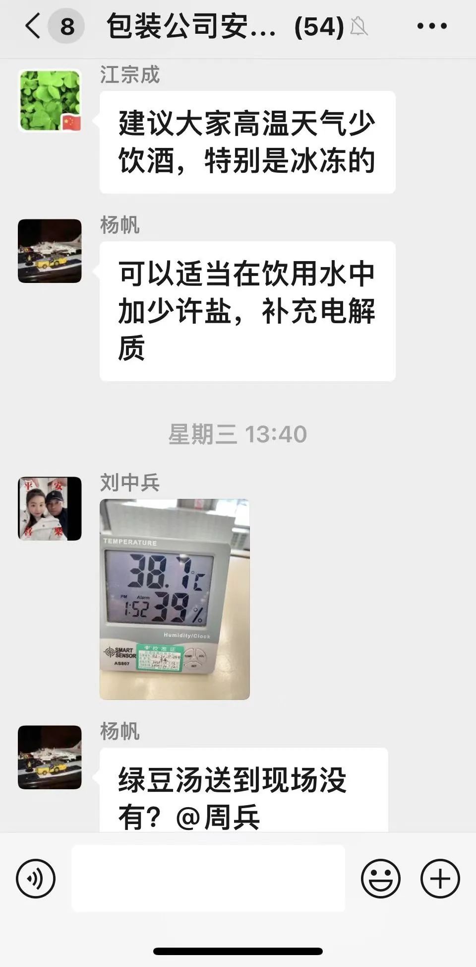 為了做好員(yuan)工防(fang)暑降(jiang)(jiang)溫工作,包裝公司通過在微信(xin)工作群里發布(bu)防(fang)暑降(jiang)(jiang)溫小貼士、夏季健康生(sheng)活小常識;利用班前會宣(xuan)貫防(fang)暑降(jiang)(jiang)溫注意事項;準(zhun)備充足防(fang)暑降(jiang)(jiang)溫藥品;組織餐飲(yin)公司每天配送綠豆(dou)解暑湯(tang)等多種(zhong)形式,“送清涼進車(che)間”關愛員(yuan)工。