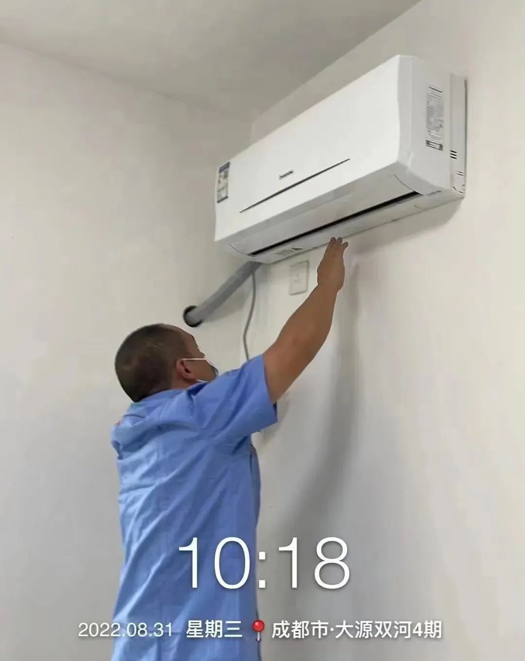 9月1日(ri)上午(wu)10:00,第二批(pi)20人的(de)安裝突擊隊完(wan)成調配,大家做好防(fang)護,進入安裝現場。9月2日(ri)早上6:50,經過西南中(zhong)心服務團隊兩天三夜的(de)持續奮戰,成都該區(qu)域隔離點586套空調搶裝完(wan)畢。