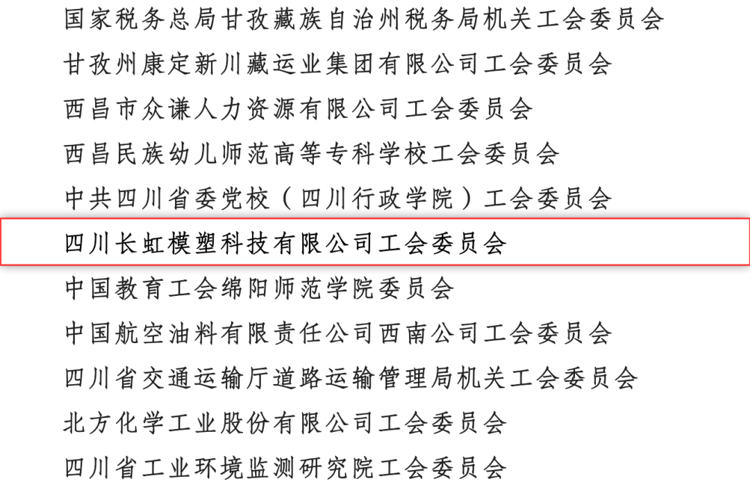 四(si)(si)(si)川省(sheng)(sheng)總工(gong)會辦公(gong)(gong)室發布(bu)四(si)(si)(si)川省(sheng)(sheng)模范職工(gong)之家名單,長(chang)虹控股集團旗(qi)下四(si)(si)(si)川長(chang)虹模塑科技有限公(gong)(gong)司(si)分工(gong)會榜上有名,被授予(yu)“四(si)(si)(si)川省(sheng)(sheng)模范職工(gong)之家”榮譽稱號。