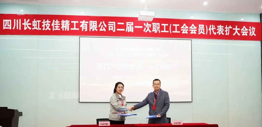 隨(sui)后,由呂代(dai)表(biao)同(tong)志作為(wei)公(gong)司(si)代(dai)表(biao),艾(ai)琳同(tong)志作為(wei)職工(gong)(gong)方(fang)(fang)代(dai)表(biao),雙方(fang)(fang)簽訂了《2023年(nian)四川長(chang)虹技(ji)佳(jia)精工(gong)(gong)有(you)限(xian)公(gong)司(si)工(gong)(gong)資集體(ti)協商協議》、《四川長(chang)虹技(ji)佳(jia)精工(gong)(gong)有(you)限(xian)公(gong)司(si)勞動安(an)全衛生專(zhuan)項集體(ti)合同(tong)》、《四川長(chang)虹技(ji)佳(jia)精工(gong)(gong)有(you)限(xian)公(gong)司(si)女職工(gong)(gong)權益(yi)保護專(zhuan)項集體(ti)合同(tong)》、《四川長(chang)虹技(ji)佳(jia)精工(gong)(gong)有(you)限(xian)公(gong)司(si)職代(dai)會集體(ti)合同(tong)》。