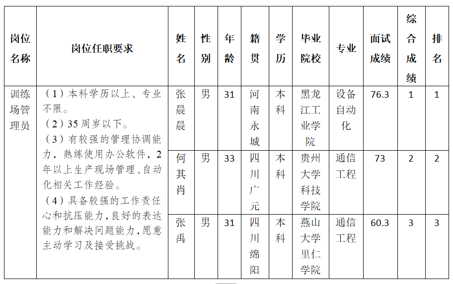 訓(xun)練場管(guan)理員崗位測試成(cheng)績(ji)的公示